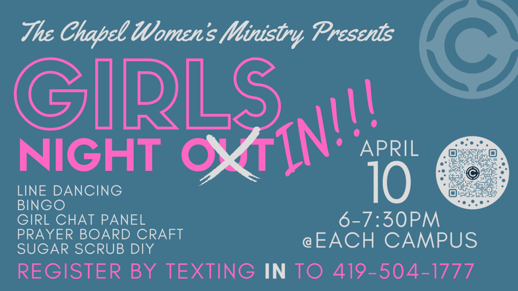 Join us Thursday, April 10 from 6-7:30 pm for “Girl’s Night In” at each campus. Invite your friends and think of two activities you’d like to do that evening!