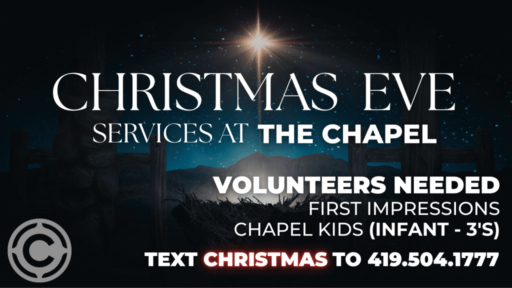 We will also have a number of volunteer opportunities at all of these services: greeting, serving hot chocolate, directing traffic in the parking lot, serving in our chapel kids ministry taking care of little ones, etc. We would welcome you and your families help. Text the word “CHRISTMAS” to 419.504.1777 to sign up to serve.