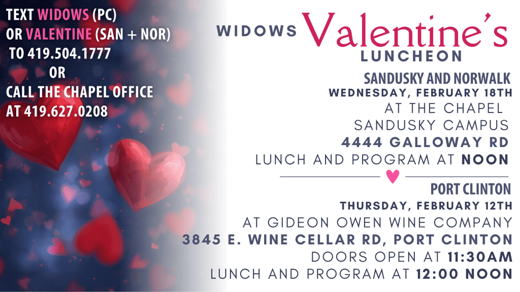 Text WIDOWS to 419.504.1777, call The Chapel office at 419.627.0208, or stop out at the Welcome Center to register!