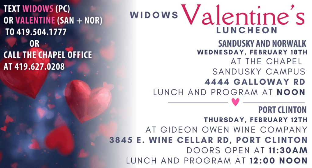 Text WIDOWS to 419.504.1777, call The Chapel office at 419.627.0208, or stop out at the Welcome Center to register!