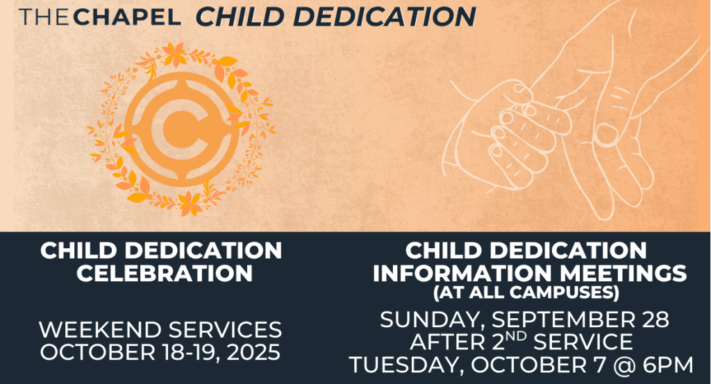 Child Dedication Information Meetings will be offered at all campuses on Tuesday, October 7th at 6pm.