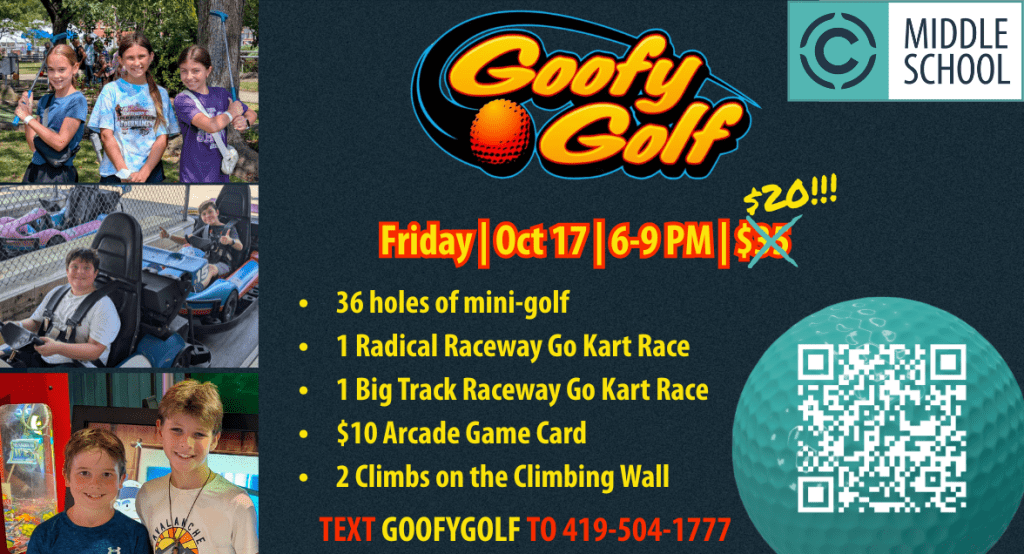 Attending the Couple’s Cornhole Event? Drop your middle schooler off with us before you blow away the competition! After securing your place in Chapel lore, swing by Goofy Golf to pick up your soon-to-be starstruck student!