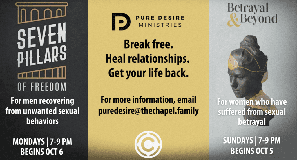 Beginning in October we are offering two small groups to support men and women in their recovery from unwanted sexual behaviors and healing betrayal trauma.there is a group for women called, "Betrayal and Beyond" and it will meet on Sunday nights. The other group for men is called "Seven Pillars" and they will meet on Monday nights. For more information email puredesire@thechapel.family.